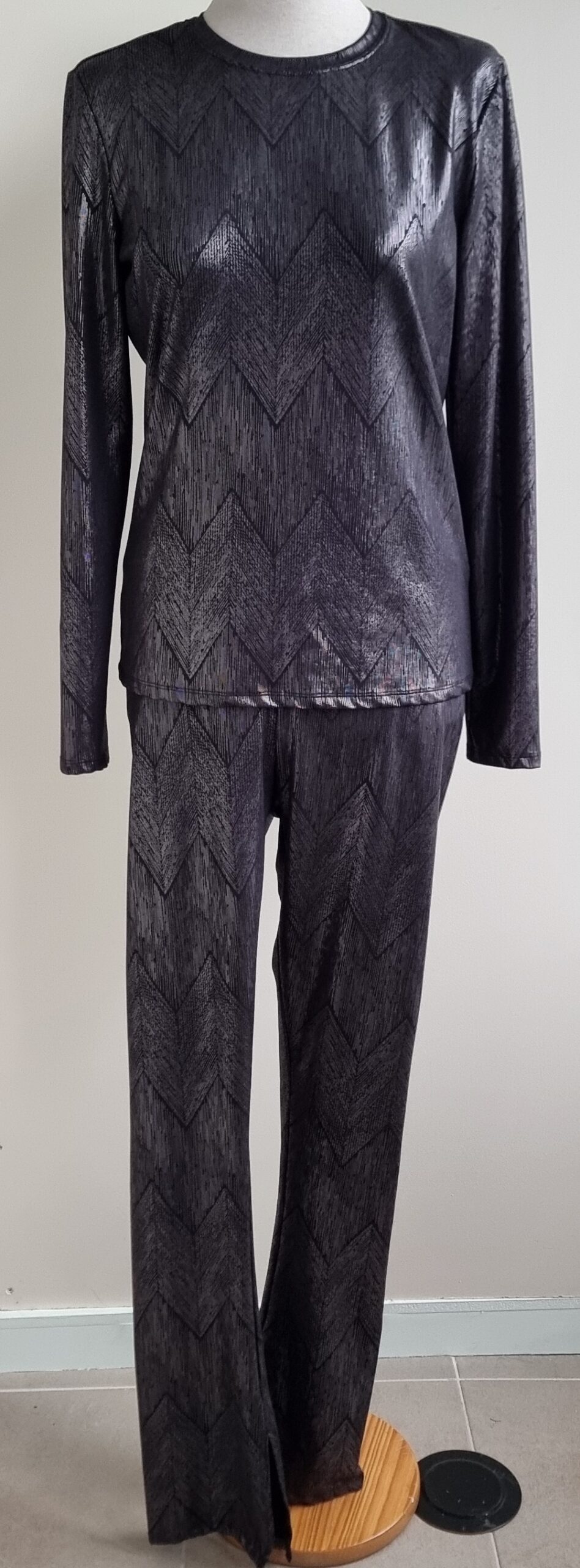 In nieuwstaat is deze prachtige zwart/zilveren soepelvallende stretchy set, bestaande uit een shirt. Lengte 64 cm., breedte 48 cm. Hieronder een broek van dezelfde stof met elastiek rond de taille en splitjes aan de zij-onderkanten van de pijpen. Lengte 107 cm., binnenbeenlengte 81 cm., taille 35 cm., maar is natuurlijk rekbaar. Materiaal: 92% polyester en 8% elastaan