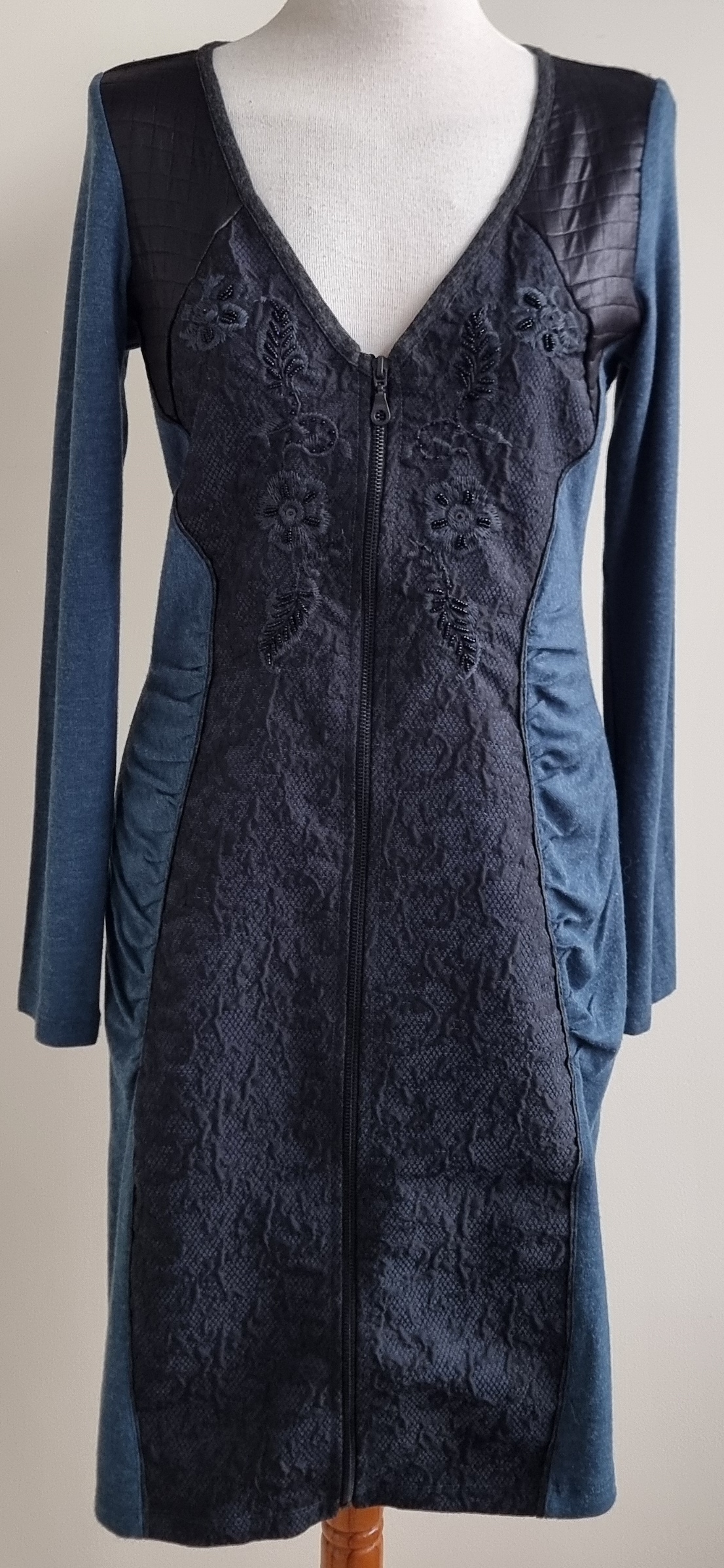 Helemaal nieuw met kaartje is deze prachtige en aparte jurk in zwart met grijs en petrolblauw, vele aparte details en ritssluiting op de voorkant. De zijkanten zijn aangerimpeld voor een mooi effect en de jurk is gemaakt van een iets stretchy materiaal. Lengte 98,5 cm., breedte 46,5 cm. Materiaal: 60% viscose, 30% polyester, 5% polyacryl en 5% elastaan.