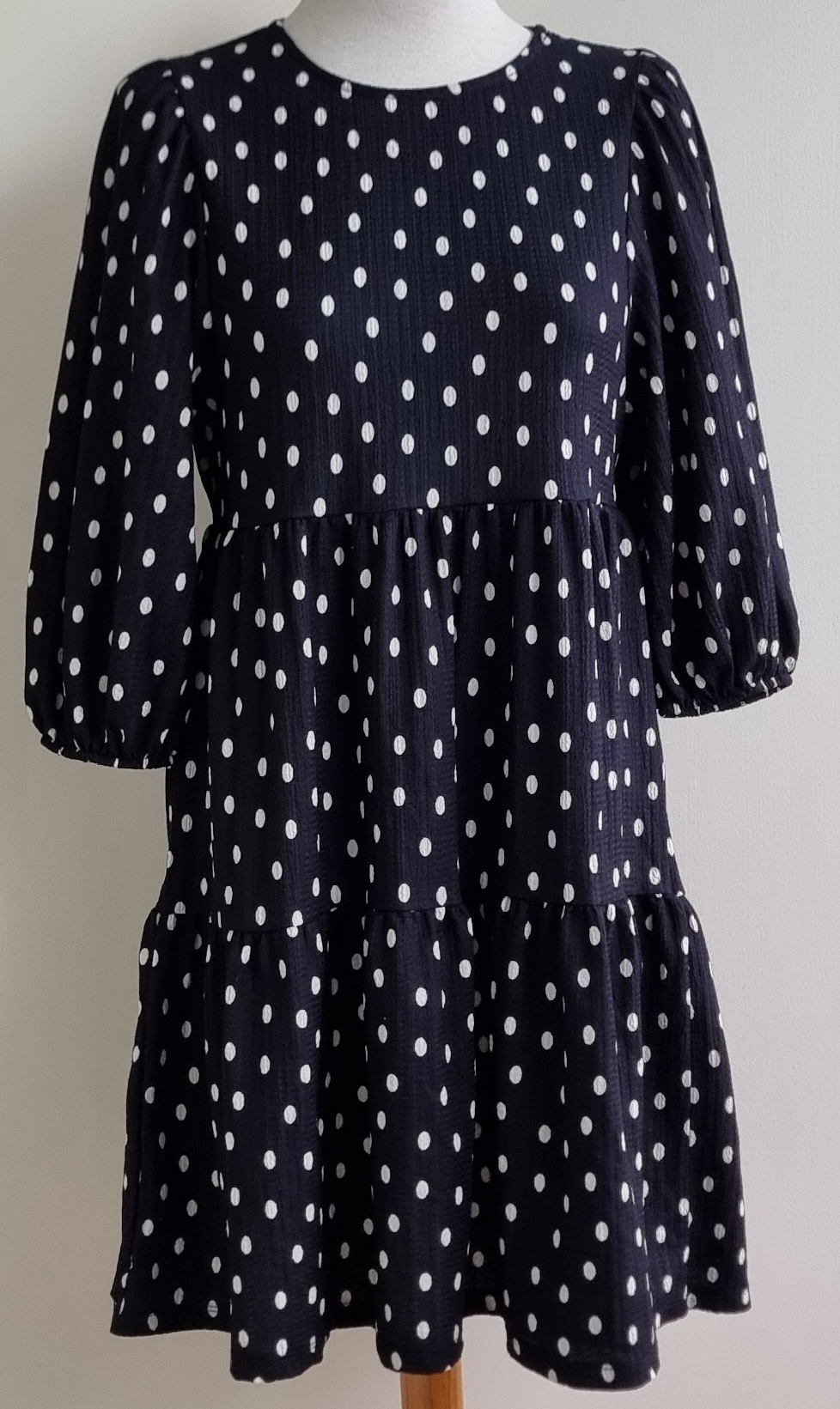Super leuk zwart jurkje van een iets zwaardere kwaliteit met witte dots. Het jurkje heeft een leuk 3/4 mouwtje en het jurkje loopt mooi uit. Lengte 89 cm., breedte 46 cm. Materiaal: 99% polyester en 1% elastaan.