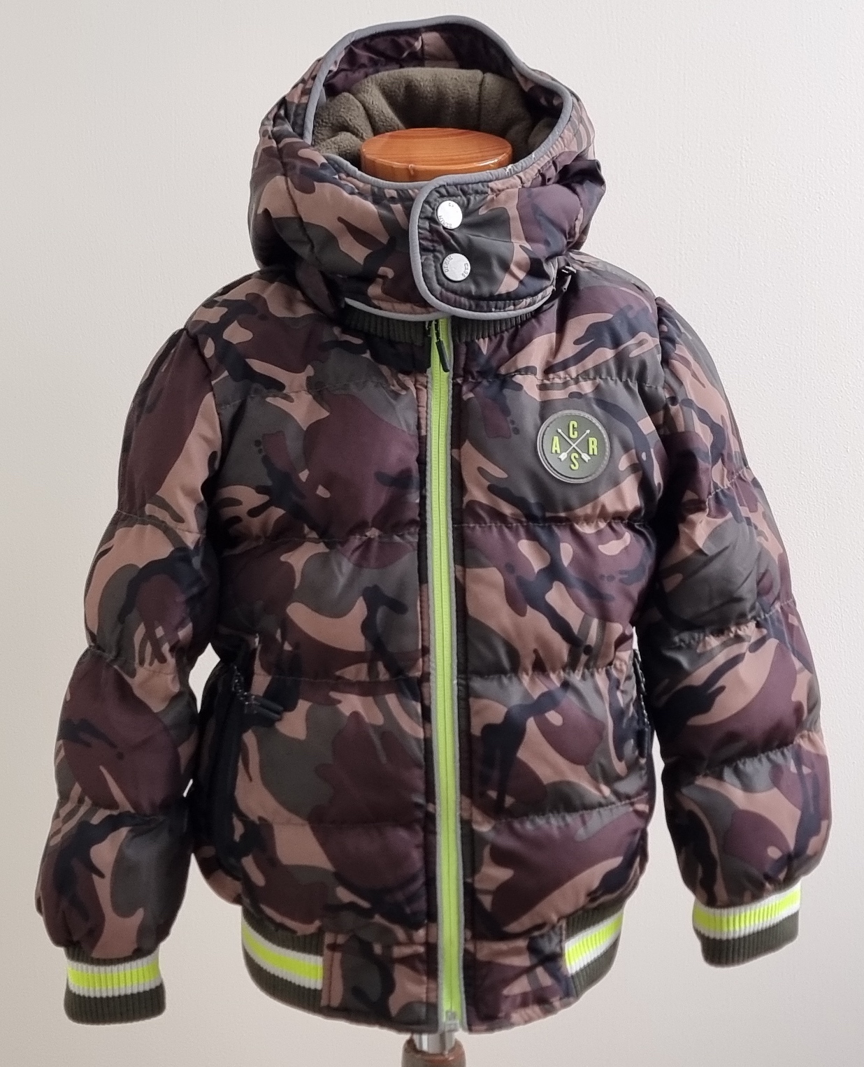Als nieuw winterjack in bruin tinten met afneembare capuchon en ritssluiting. Verschillende labels, 2 zakken op de voorkant. Lengte 48 cm., breedte 39,5 cm. Materiaal: 100% polyester.