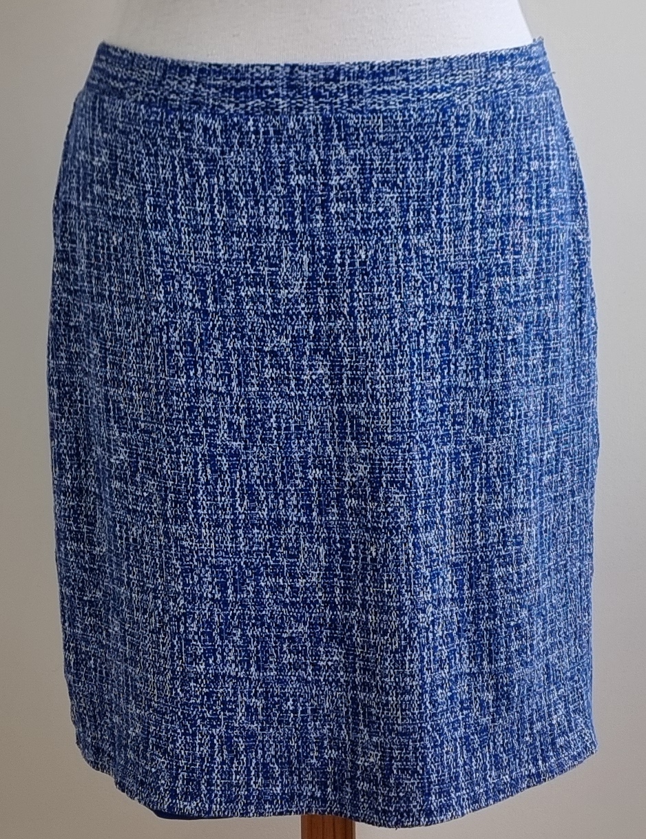 Prachtig blauw gemelleerd rokje met elastische tailleband en het rokje is geheel gevoerd. Lengte 55,5 cm., taille 42 cm., maar is natuurlijk rekbaar. Materiaal: 44% katoen, 38% viscose, 11% polyamide en 3% elastaan. De voering is 82% acetate en 18% polyamide.