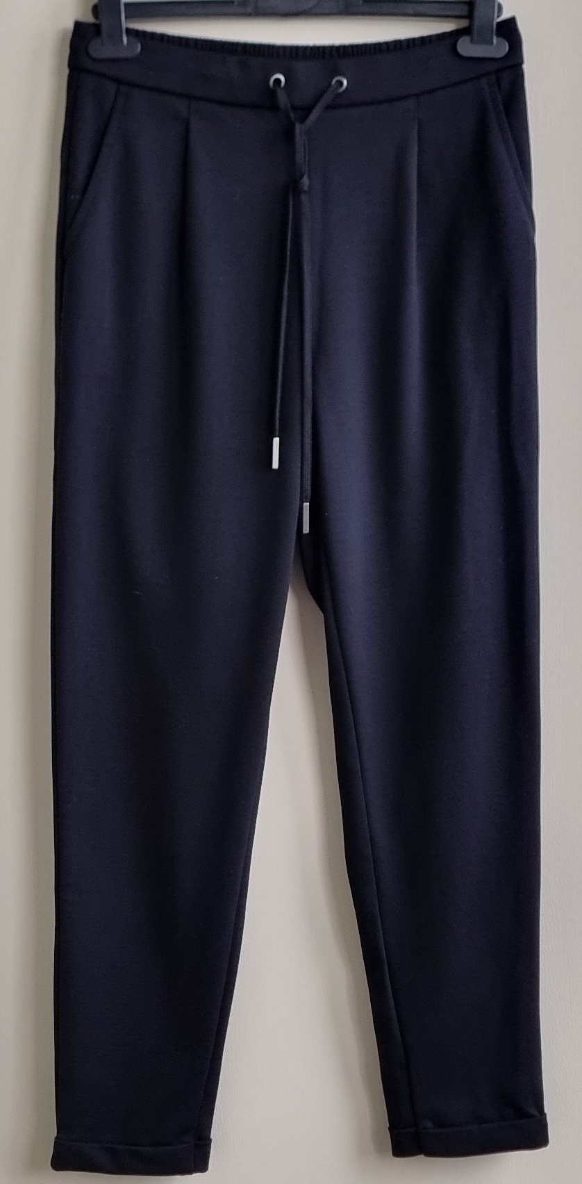 In nieuwstaat is deze zwarte broek van een zwaardere kwaliteit met elastiek aan de achterkant in de taille en koordjes om op maat te strikken. Twee zakken op de voorkant en 2 namaakzakken op de achterkant en vastzittende omslagen aan de onderkant van de pijpen. Lengte 95 cm., binnenbeenlengte 67,5 cm., taille 35 cm., maar is natuurlijk rekbaar. Materiaal: 76% polyester, 22% viscose en 2% elastaan.