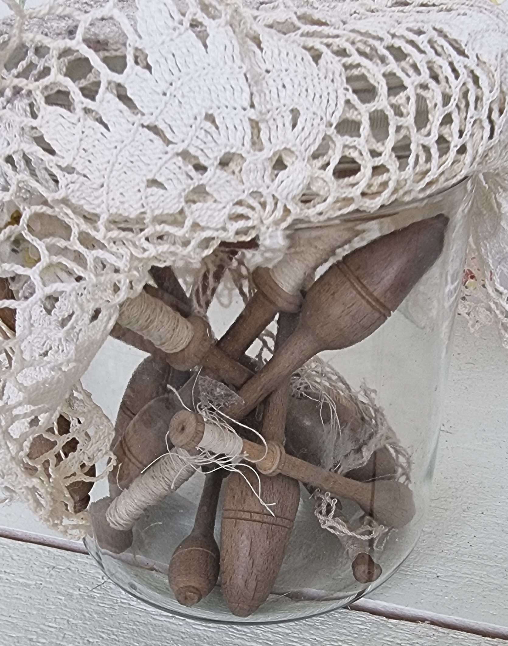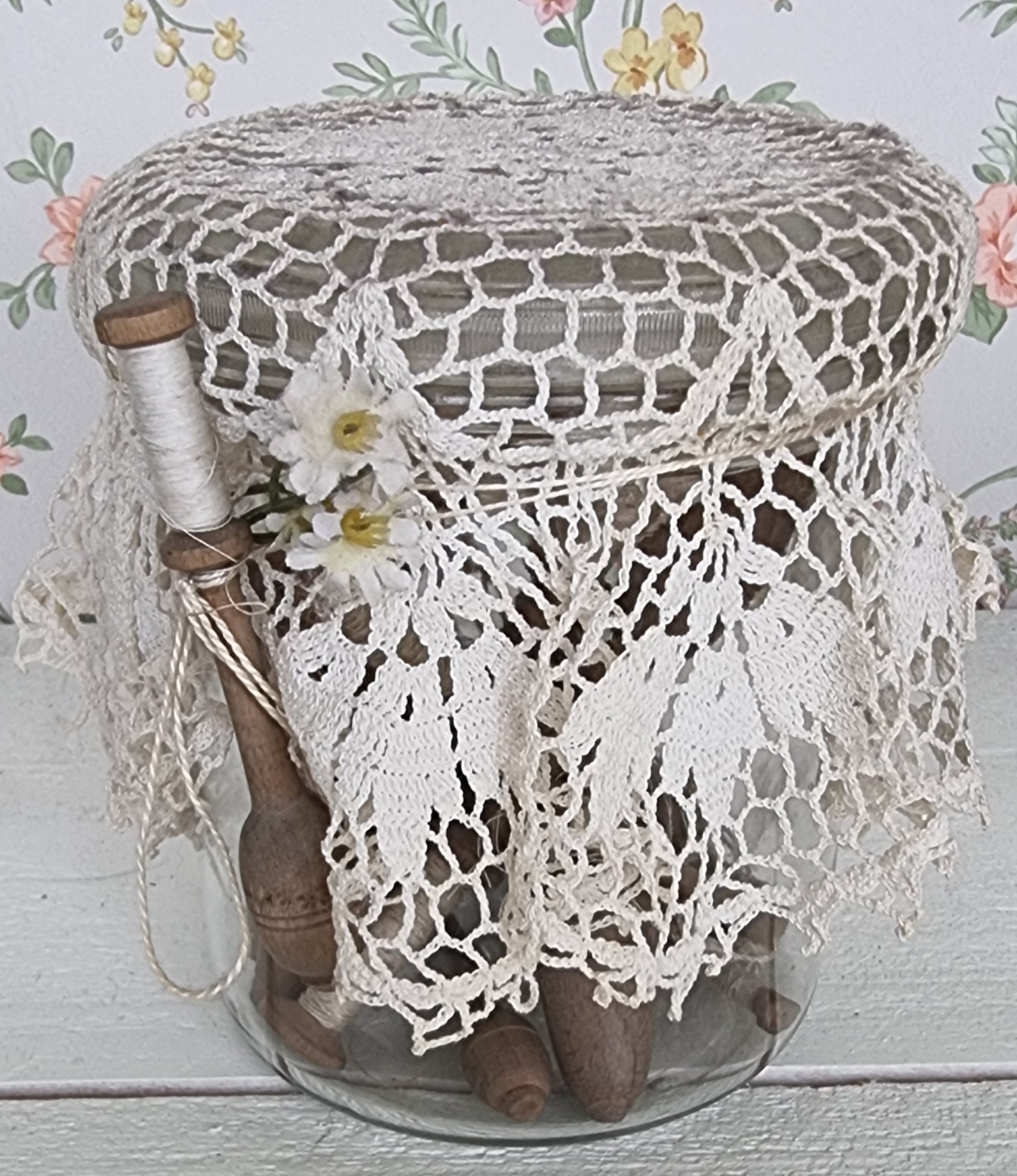 Hele mooie glazen pot met deksel versierd met kanten kleedje en klosje en ook de pot zit vol met klosjes. Super leuk voor een brocante look, interieur. De post is 14 cm. hoog.