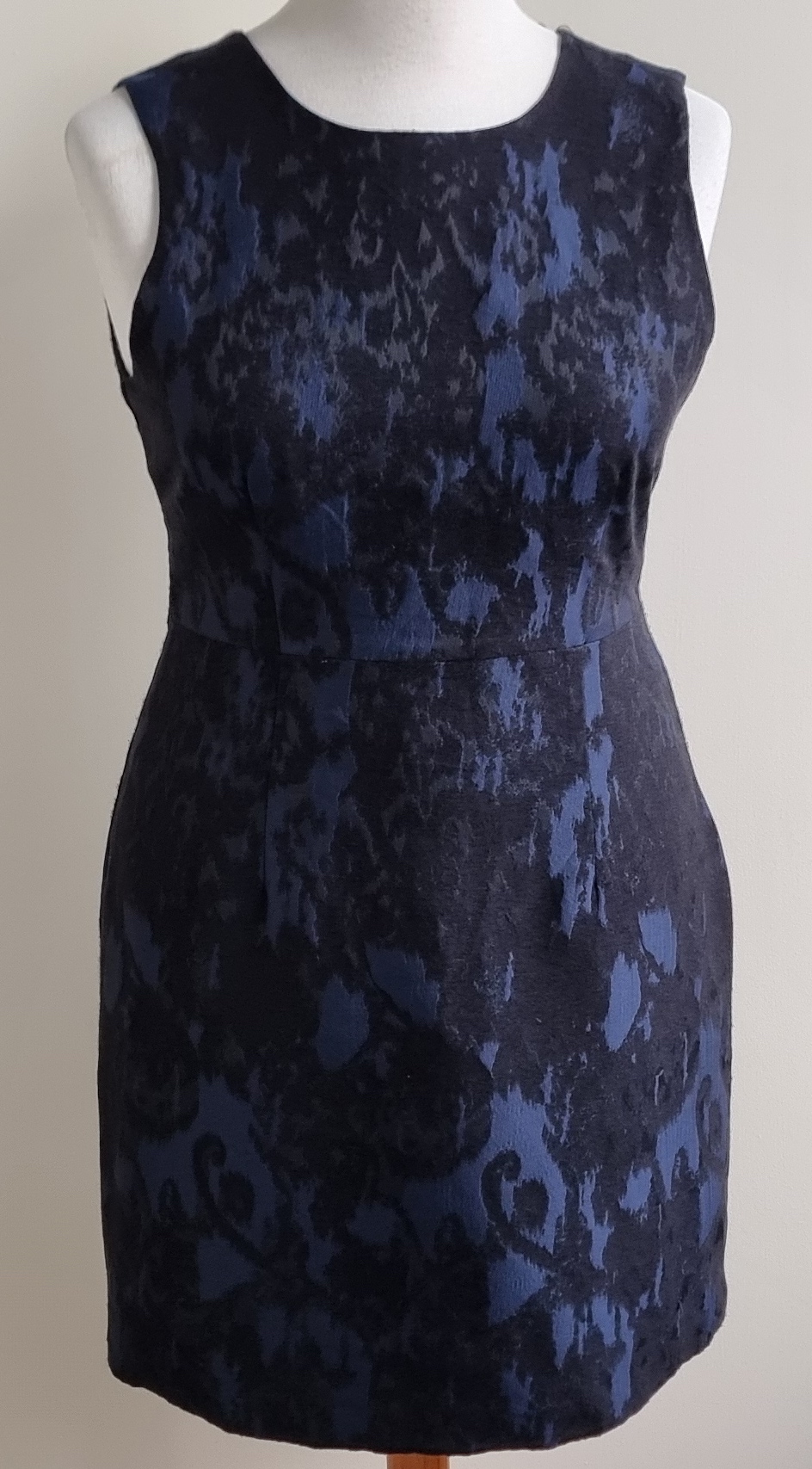 Prachtige stijlvolle blauw/zwarte jurk met drukknoop-ritssluiting op de achterkant en de jurk is geheel gevoerd. Lengte 90 cm., breedte 49 cm. Materiaal: 54% polyester, 46% katoen en de voering is 100% polyester.