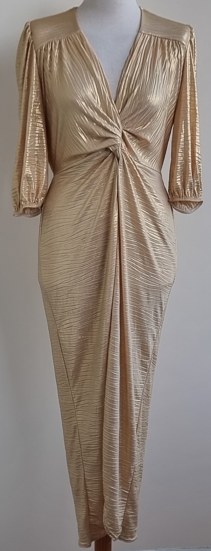 In super staat is deze feestelijke goudkleurige jurk van een stretchy materiaal, 2/4 tot 3/4 mouwtje, mooie bewerking op de voor-bovenkant en split op de voor-onderkant. Lengte ongeveer 128 cm., breedte 49 cm.