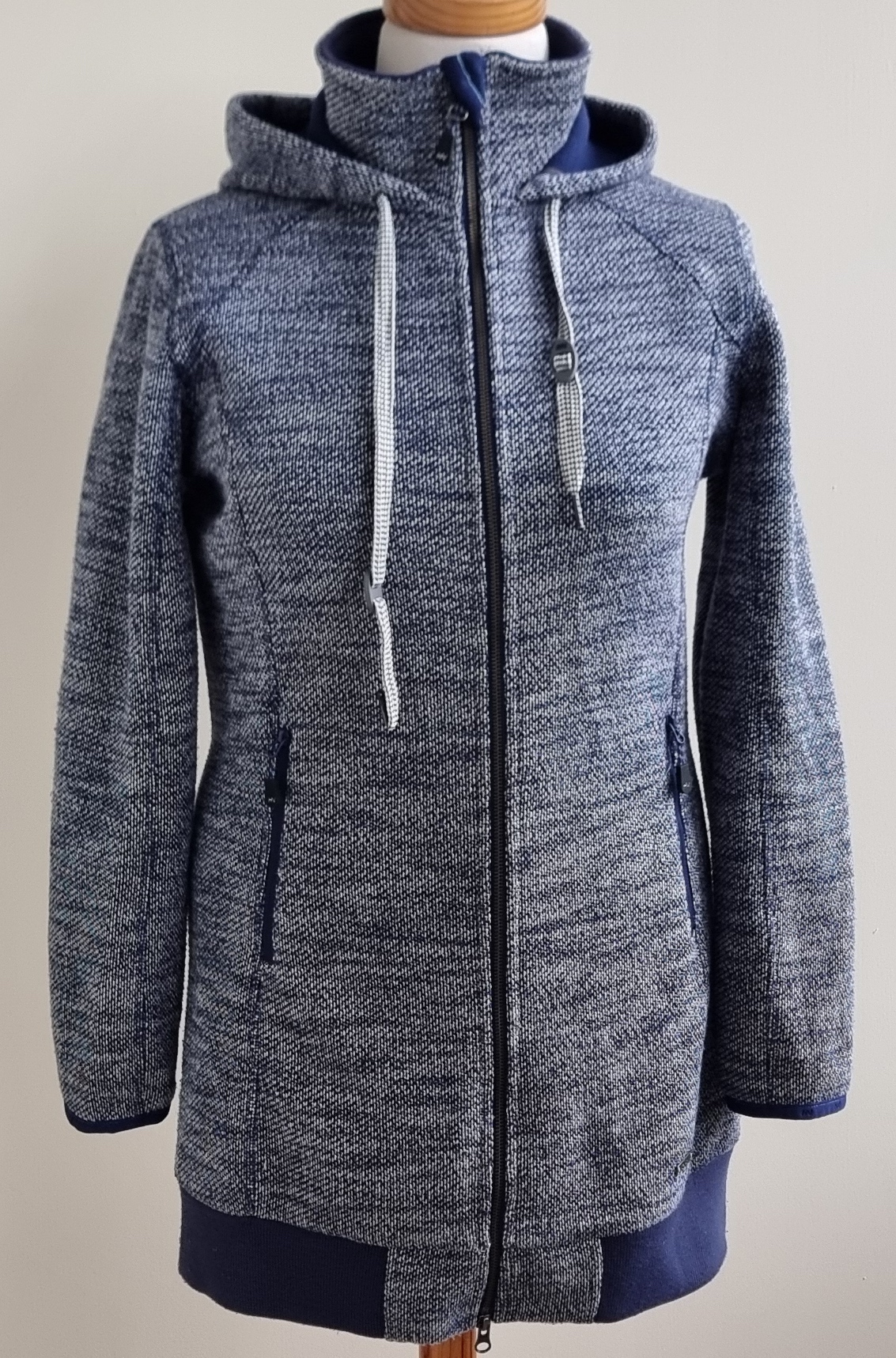 Super mooi blauw gemelleerd langer buiten vest met vastzittende capuchon, ritssluiting, 2 zakken op de voorkant met ritsen en mooi geborduurd label op 1 van de mouwen. Het vest is heerlijk gevoerd met een zachte blauwe fleecestof en 2 binnenzakken. Lengte 84 cm., breedte 56 cm. Materiaal: 55% katoen en 45% polyester.
