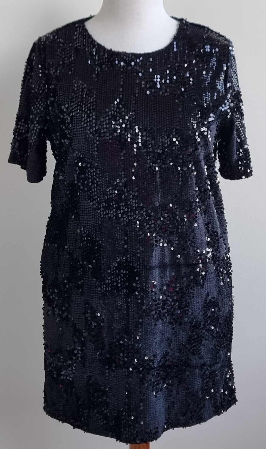 Prachtig zwart feestelijk tuniek, geheel versierd met zwarte lovertjes in verschillende maten en knoopje op de achter-bovenkant. Het tuniek is bahlve de mouwen geheel gevoerd. Lengte 84 cm., breedte 53 cm. Materiaal: 95% polyester en 5% elastaan, De voering is 100% polyester.