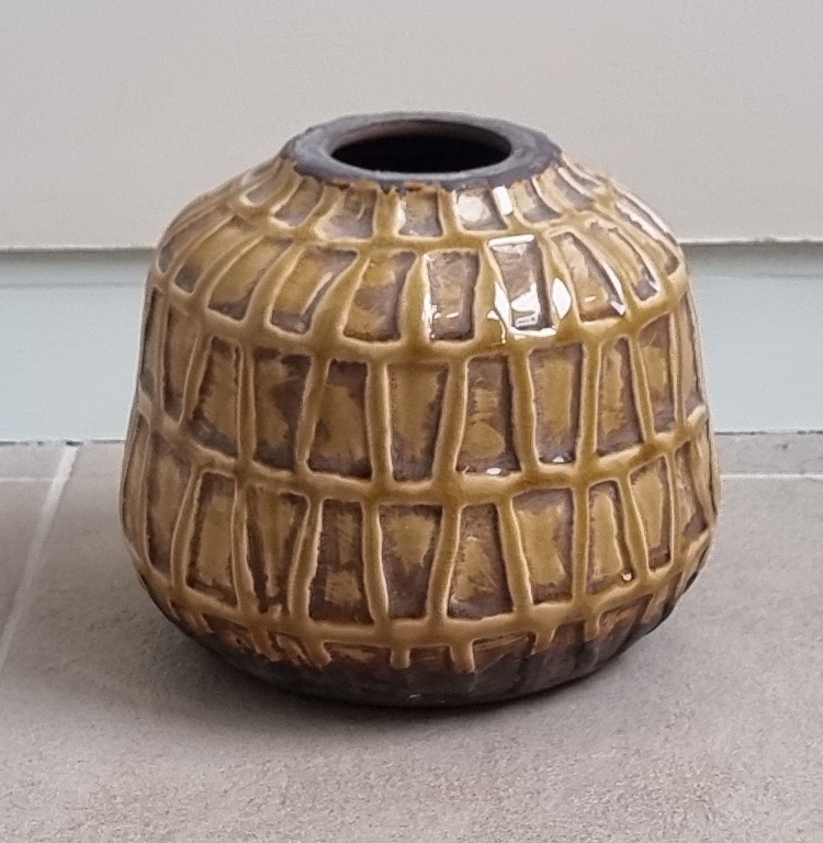 Nooit gebruikt deze bruin/mosterdgele retro vaas, prachtig model, maar niet water resitant. Goed te gebruiken als siervaas met kunstbloemen en takken. De hoogte is ongeveer 17 cm. en de doorsnee aan de onderkant gemeten is ongeveer 18 cm.
