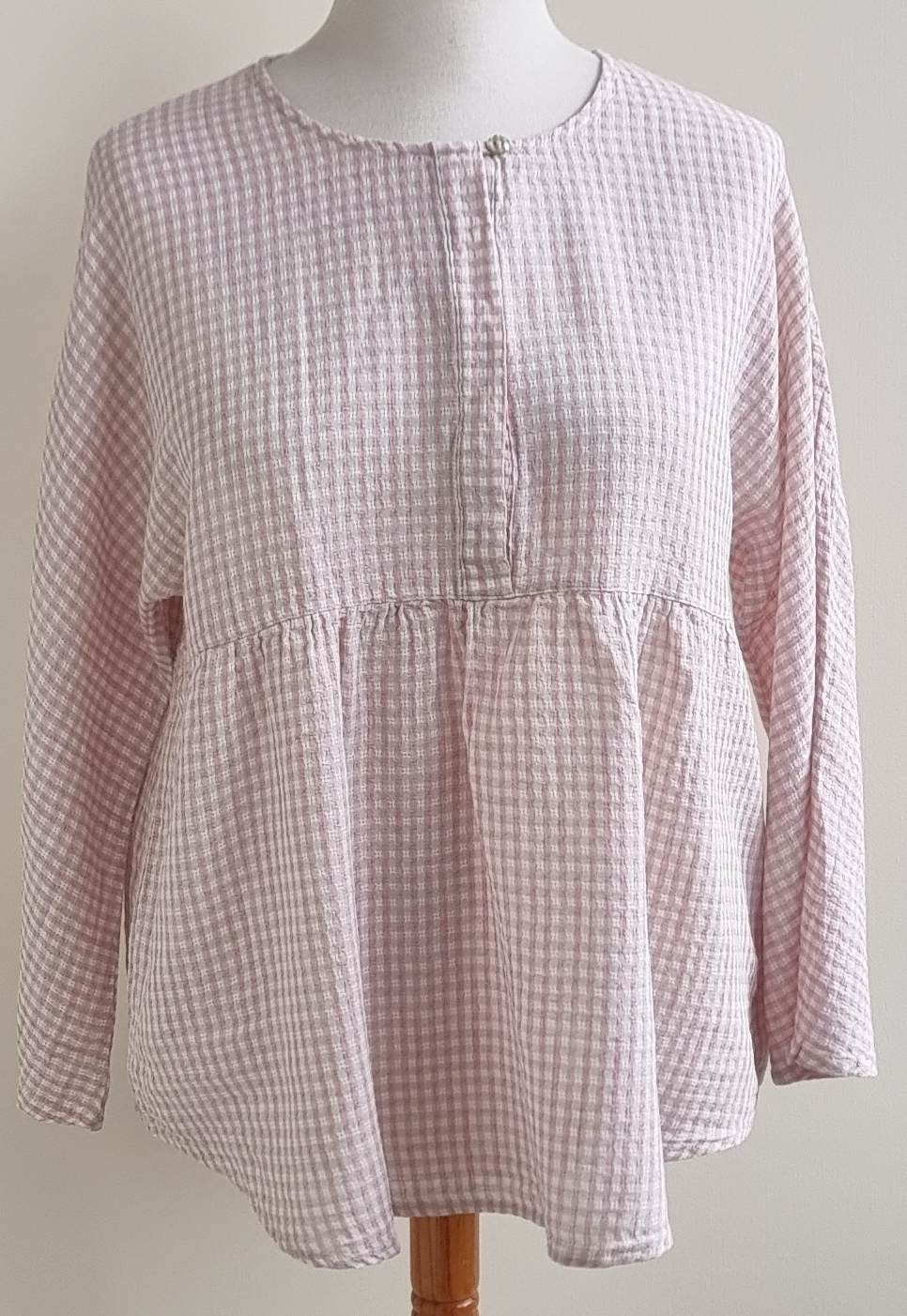 Zo mooi deze roze/witte blouse met op de voorkant gedeeltelijk een knoop-drukknoopsluiting en halverwege loopt de blouse mooi uit. Lengte voorkant 72 cm., achterkant 74 cm., breedte 56 cm. Materiaal: 75% linnen en 25% katoen.