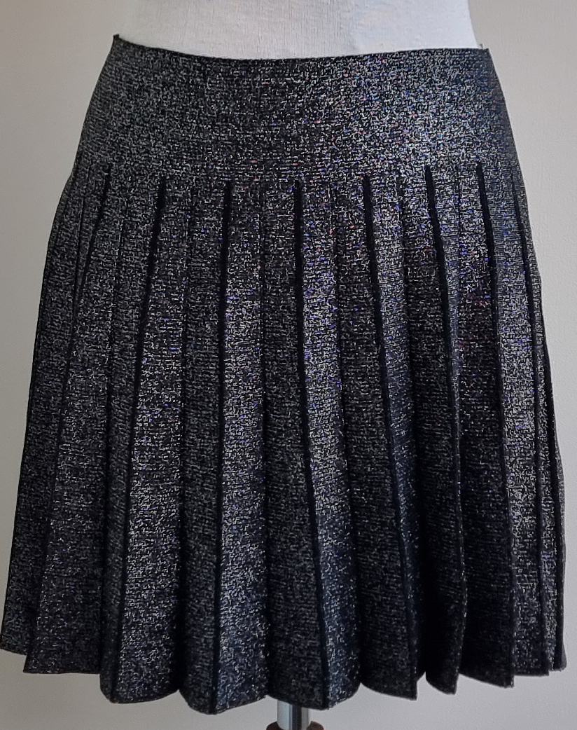 Als nieuw is dit zwart/zilverkleurig plooi rokje met glittertje. Het rok is van een zwaardere kwaliteit en is iets stretchy. In het rokje staat maat L, maar valt echt kleiner. Lengte 45,5 cm., taille 35 cm., maar is nog rekbaar. Materiaal: 70% viscose en 30% polyester.