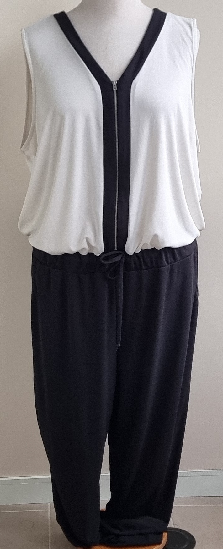 Prachtige en stijlvolle jumpsuit, waarbij het net lijkt of je een creme blouse draagt met zwarte broek. De jumpsuit heeft een rits en zwarte bies langs de hals. Elastische tailleband met bindstrikje om op maat te strikken en de broekgedeelte heeft zakken op de voor- en achterkant. Lengte is 171 cm., binnenbeenlengte 76 cm., breedte 69 cm. Materiaal: 100% polyester.
