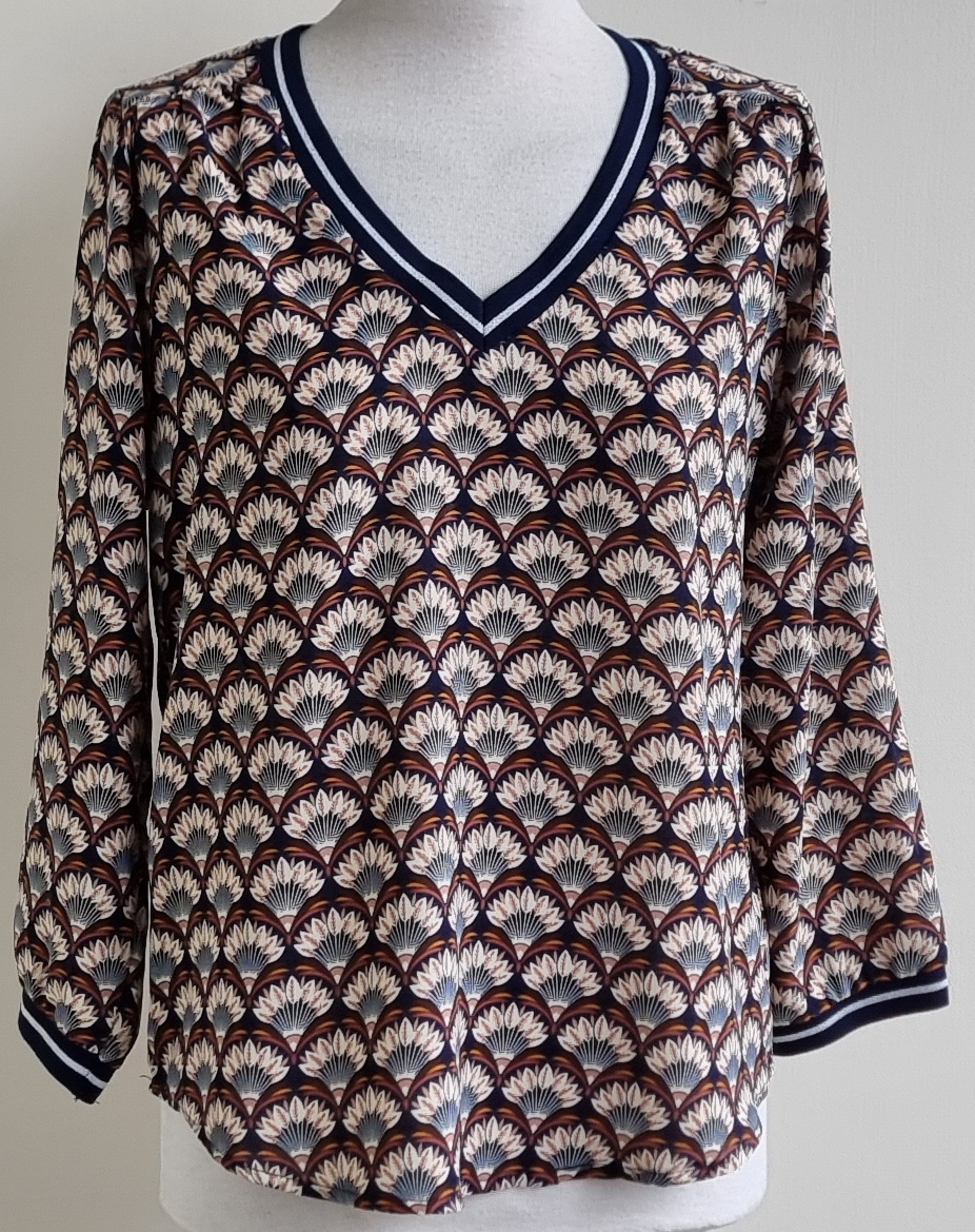 In nieuwstaat is dit bloesje met een super mooie print en donkerblauw/zilveren boordje langs de hals en de onderkant van de mouwen. Lengte 65 cm., breedte 53,5 cm. Materiaal: 100% polyester.