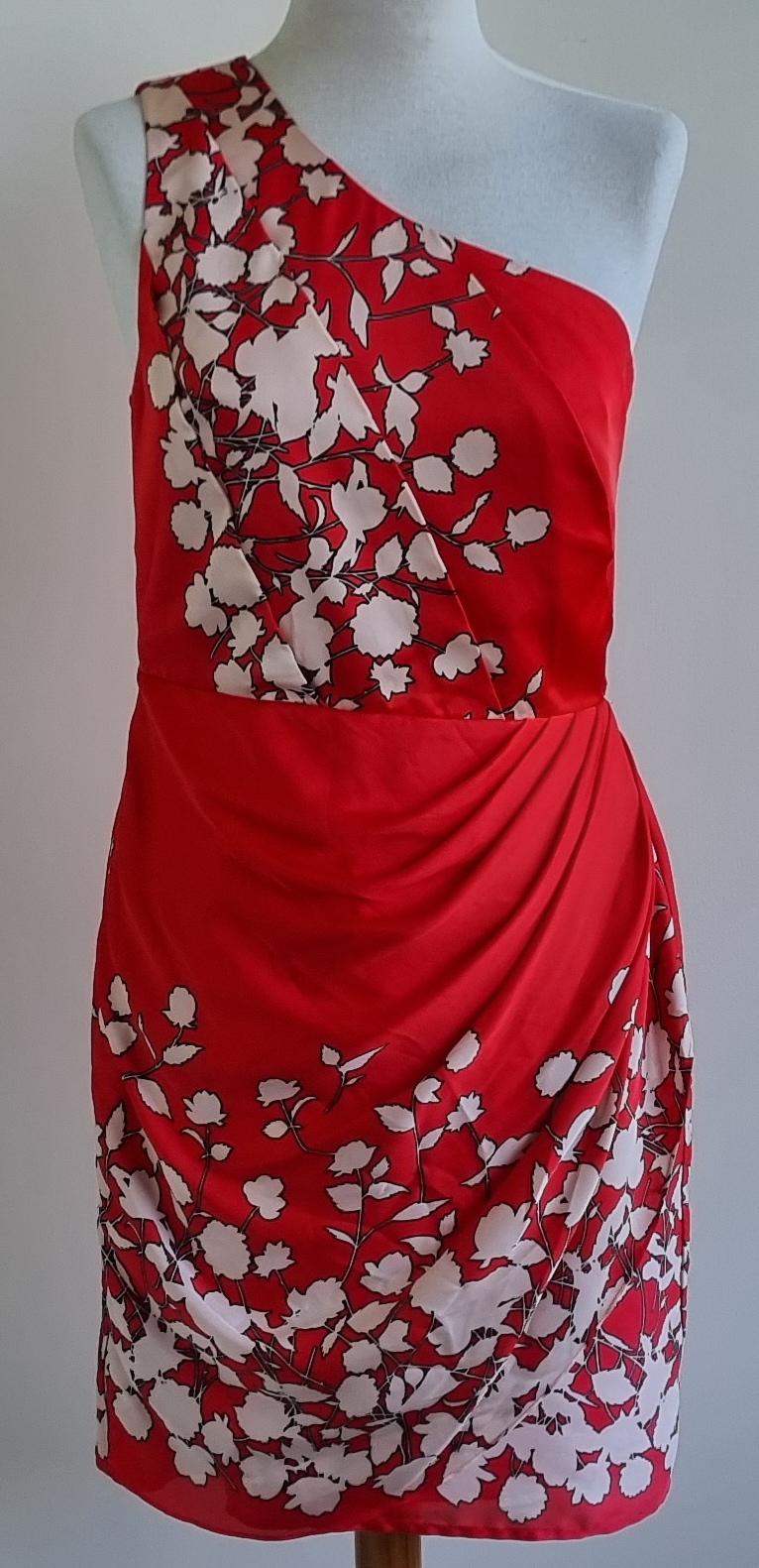 Prachtige rode a-symetrische jurk met print op de voor- en achterkant. Prachtige aanrimpelingen, ritssluiting aan de zijkant en de jurk is geheel dun gevoerd. Lengte 93 cm., breedte 42,5 cm. Materiaal: 100% polyester.