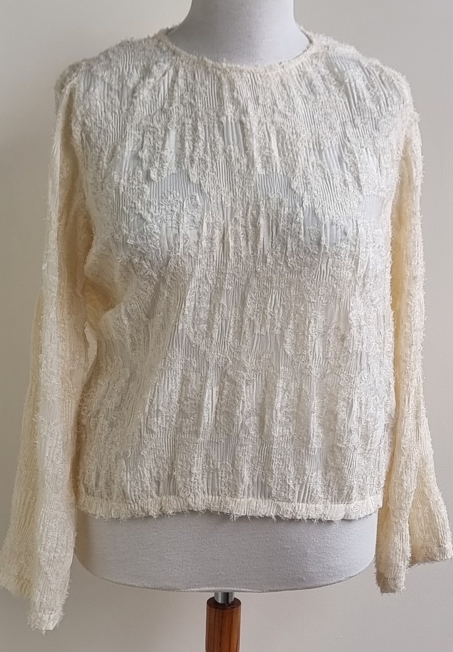 Helemaal nieuw met kaartje is deze top in sandshell kleur met knoopje op de achterkant en een soort van een iets harige applicaties. Lengte 61 cm., breedte 60 cm. Materiaal: 100% polyester.