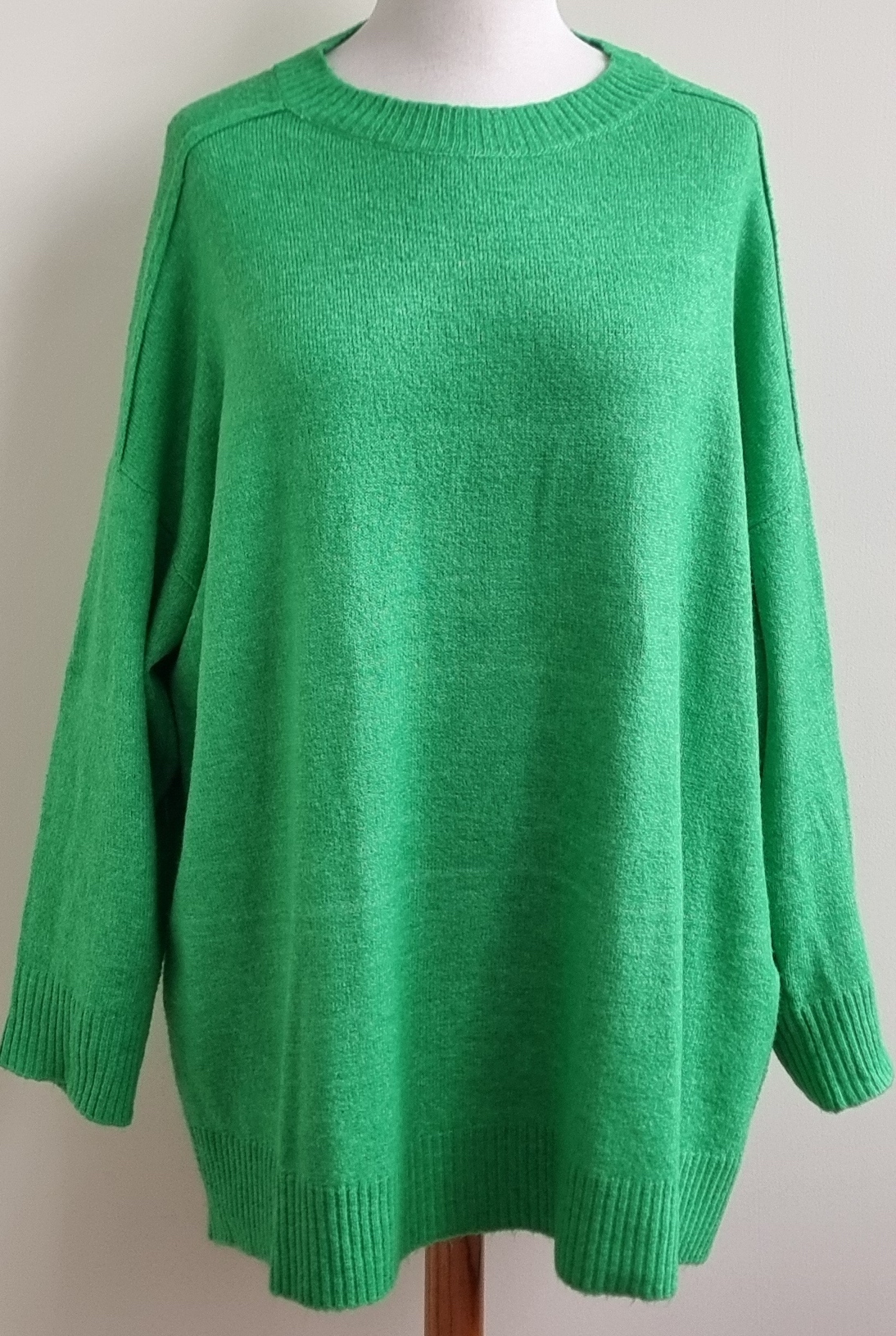 Prachtige oversized trui in een fellere kleur groen van een gebreid materiaal. Lengte 82 cm., breedte 76 cm. Materiaal: 82% polyester, 15% acryl en 3% elastaan.