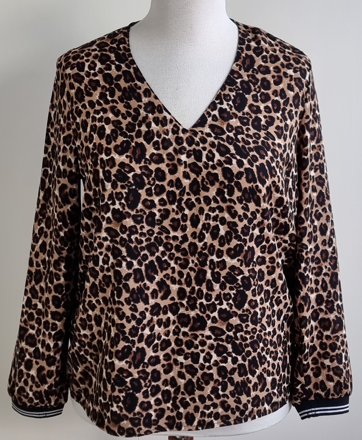Als nieuw is deze zwart/bruine blouse met dieren print met boordjes aan de onderkant van de mouwen. Lengte 68 cm., breedte 56,5 cm. Matreiaal: 100% polyester.