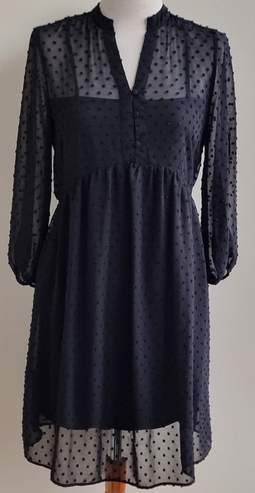 In perfecte staat is dit leuke zwarte jurkje met klein werkje in de stof. Gedeeltelijk een knoopsluiting op de voorkant en daaronder is de stof mooi aangerimpeld waardoor het jurkje mooi uitloopt. Het jurkje heeft een onder jurkje en biesjes aan de zijkanten in de taille, welke je op de achterkant op maat kan strikken. Lengte 94 cm., breedte 49 cm. Materiaal: 100% polyester.