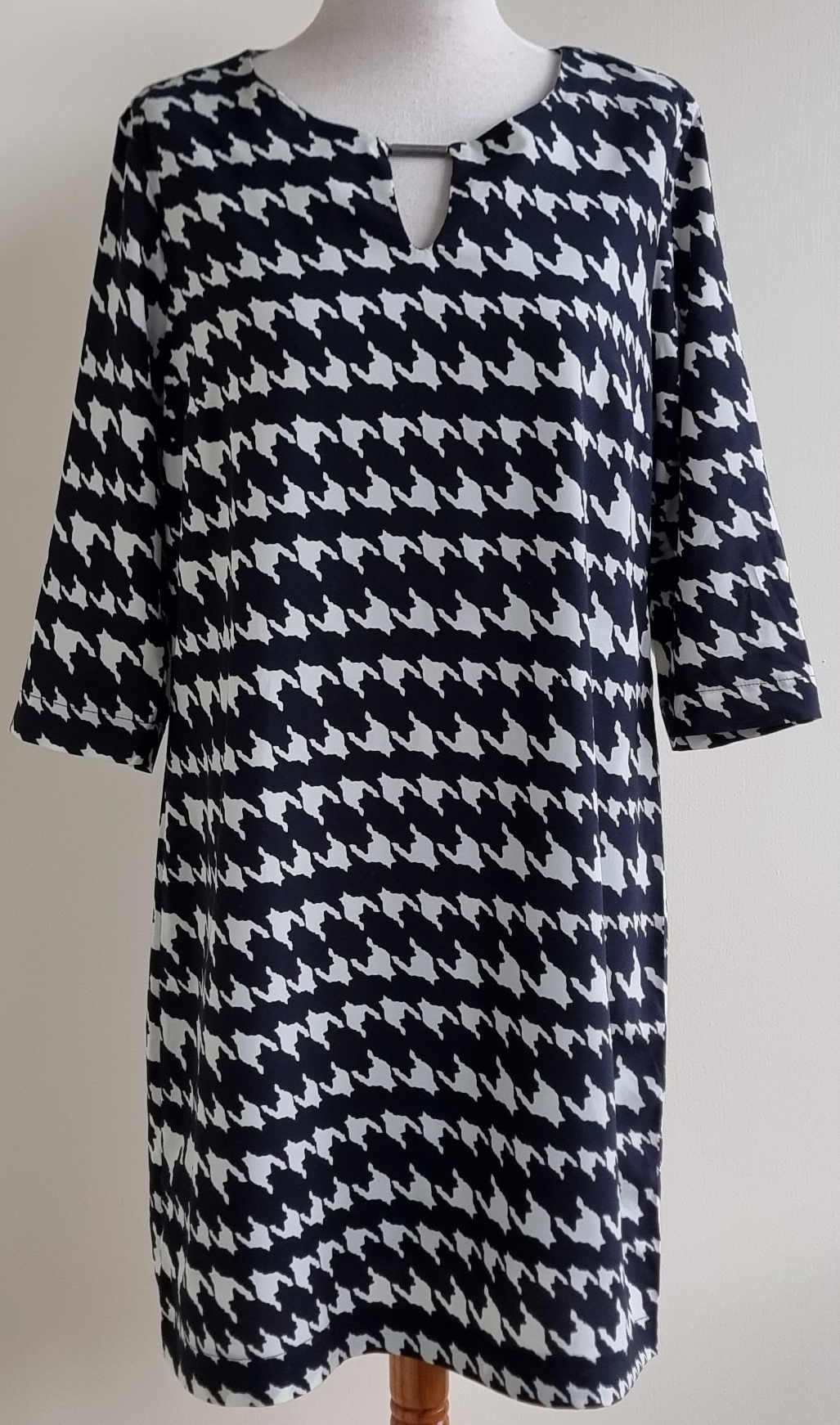 Hele mooie zwart/witte jurk met mooie print. Ritssluiting op de achterkant en mooie bewerking bij de hals. De jurk heeft een 3/4 mouwtje en is behalve de mouwen gevoerd. Lengte 95 cm., breedte 53,5 cm. Materiaal:100% polyester.