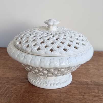 In perfecte staat is deze mooie roomwitte open gewerkte schaal met deksel. De schaal is ongeveer 19 cm. hoog en heeft een doorsnee van 20 cm