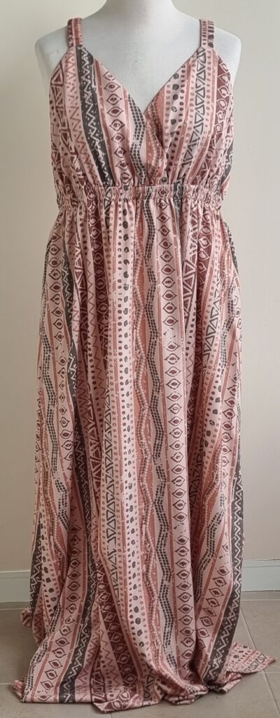 Als nieuw is deze lange jurk in natuurlijke kleuren met elastische schouderbandjes en de achter-bovenkant is elastisch, waardoor hij mooi aansluit. Rondom nog een elastische bies en 2 splitten aan de zijkanten. Lengte 158 cm., breedte 56 cm, maar is rekbaar. Materiaal: 92% polyester en 8% elastaan.