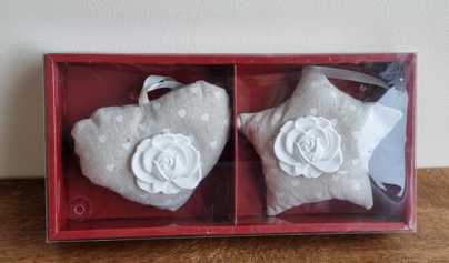 Nieuw in doos zijn deze leuke beige hangers met witte hartjes print en witte bloemen applicatie op de voorkant. Er zit een heerlijk luchtje in de hanger.