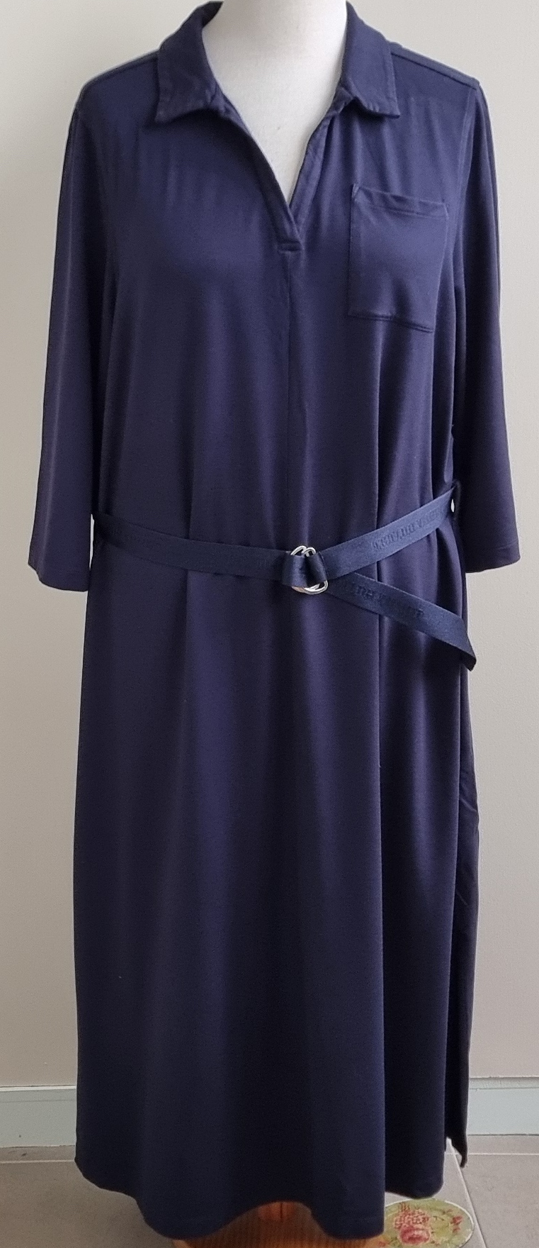 Super mooie marine blauwe jurk van een mooie zwaardere kwaliteit met 3/4 mouwtje en zakje op borsthoogte. Metalen logootje op 1 van de mouwen en op de riem rondom Tommy Hilfiger. Lengte 128 cm., breedte 60,.5 cm. Materiaal: 94% viscose en 6% elastaan.