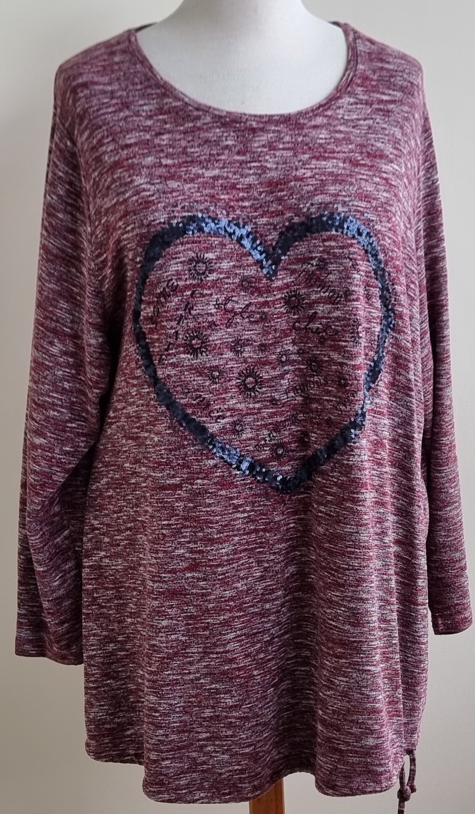 Super mooie rood/grijs gemelleerde trui van een iets fijner gebreid materiaal met op de voorkant een hart applicatie van kleine lovertjes met daarin kleine printjes. Koordje door de onderkant om op maat te strikken. Lengte 84 cm., breedte 76 cm. Materiaal: 53% polyester, 40% viscose en 7% elastaan.