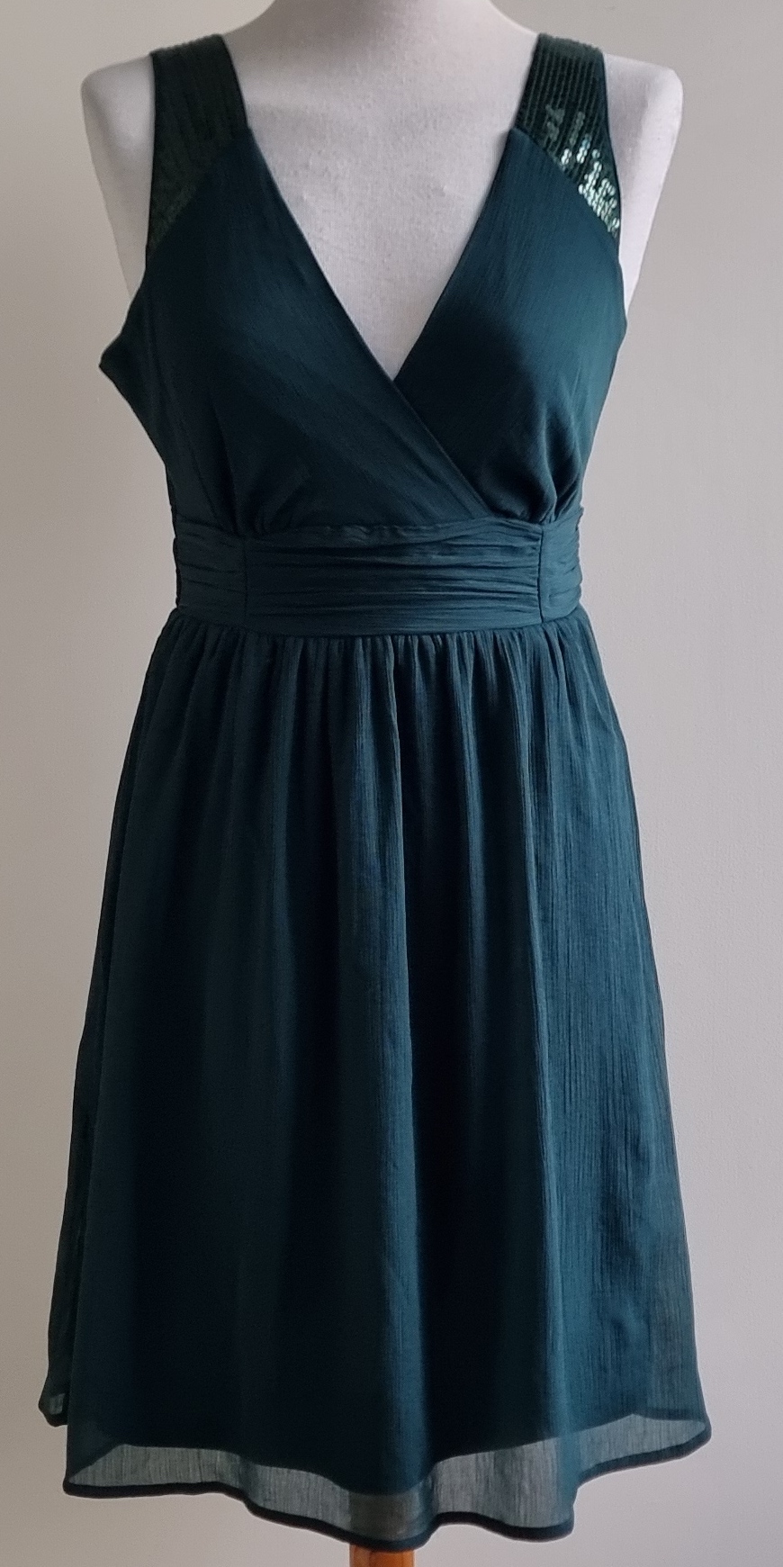 In perfecte staat is dit jurkje met lovertjes op de schouderbanden en de achter-bovenkant is gedeeltelijk gesmokt, waardoor hij mooi aansluit. Vanaf de taille loopt het jurkje mooi uit en is geheel gevoerd. Lengte 93,5 cm., breedte 44,5 cm. Materiaal: 100% polyester.