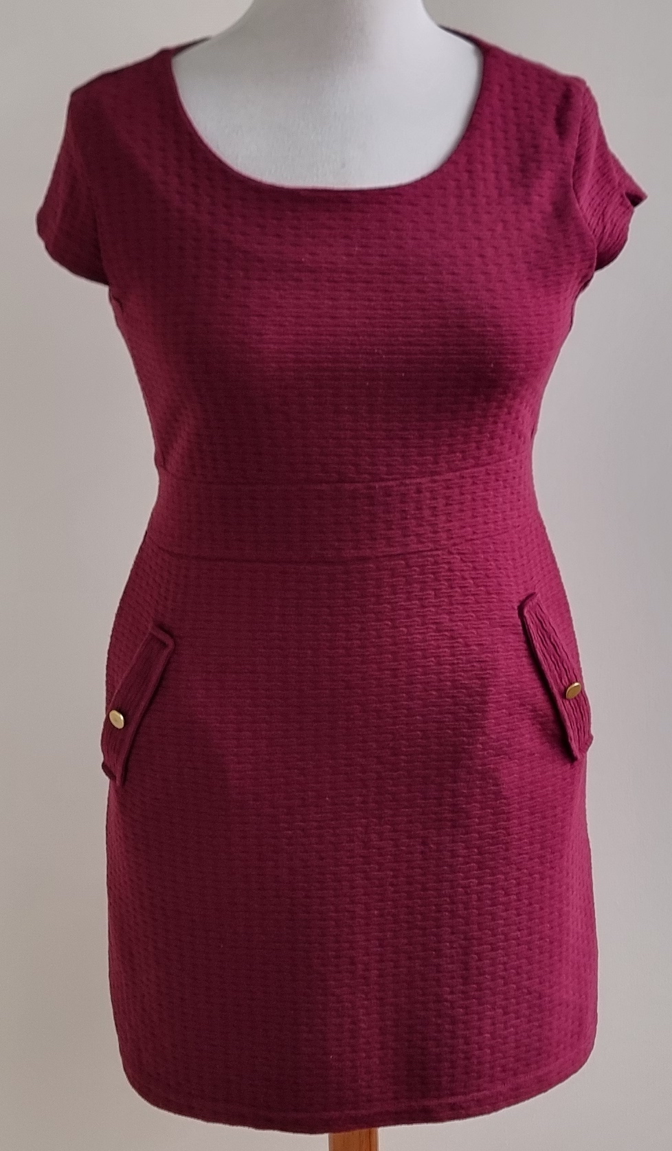 Geweldige wijnrode jurk van een zwaardere kwaliteit en ritssluiting op de achterkant. De jurk is iets stretchy, heeft 2 zakken op de voorkant en is behalve de mouwtjes geheel gevoerd. Lengte 88,5 cm., breedte 48 cm. Materiaal: 65% polyester en 35% katoen.