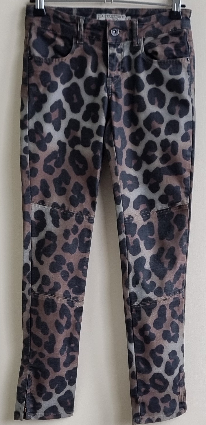 Gave bruin/grijze jeans met zwarte dierenprint, knoop-ritssluiting en knoopsgatelastiek in de tailleband om wat te stellen. Twee zakken op de voorkant en 2 zakken op de achterkant. Ritsjes aan de onder-zijkanten van de pijpen. Lengte 87 cm., binnenbeenlengte 69,5 cm., taille 31,5 cm. Materiaal: 71% katoen, 26% polyester en 3% elastaan.