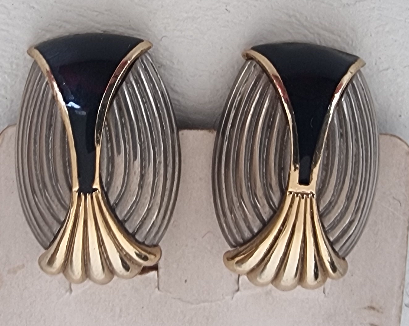 Hele gave vintage oorbellen in zilver met goud en ook iets van zwart. De oorbellen hebben clips en zijn 2,8 cm. lang.