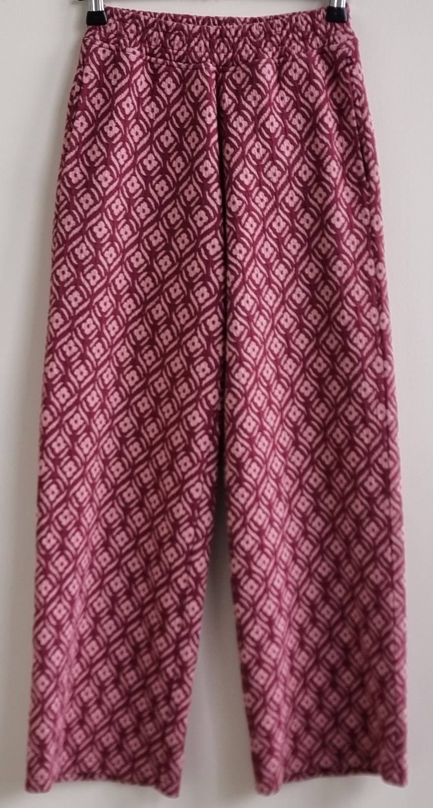 Heerlijk warme broek in 2 tinten roze met bloemen print. Elastiek rond de taille en flair pijp. Lengte 90 cm., binnenbeenlengte 67 cm., taille 27 cm., maar is natuurlijk rekbaar. Materiaal: 60% polyester, 36% katoen en 4% elastaan.
