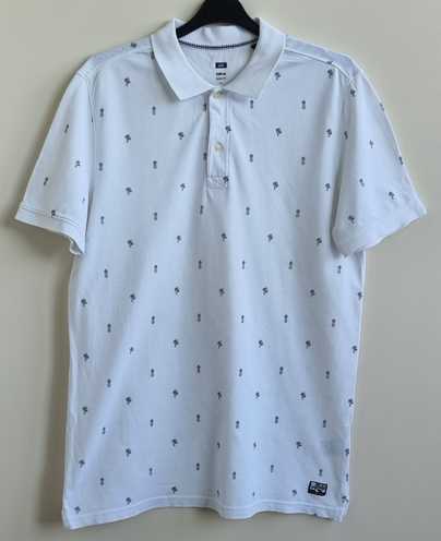 Gave witte polo van een mooie kwaliteit met gedeeltelijk een knoopsluiting op de voorkant. De polo heeft kleine donkerblauwe printjes van palmboompjes en ananassen. Labeltje aan de onderkant. Lengte 74,5 cm., breedte 52 cm. Materiaal: 100% katoen.