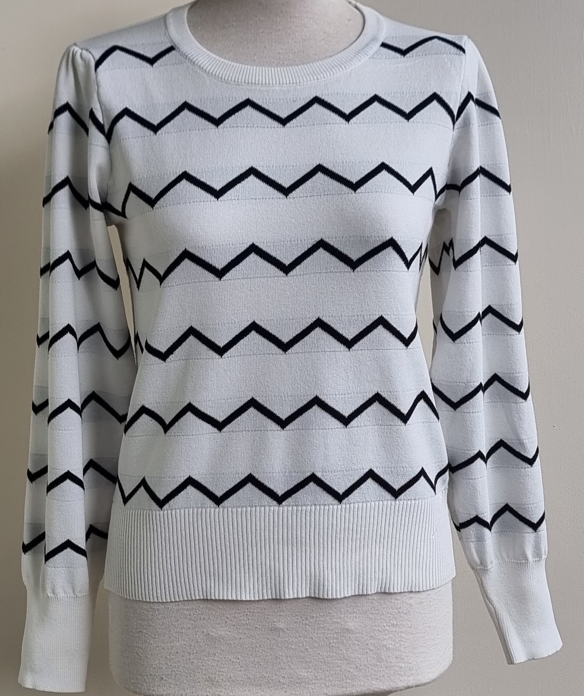 In perfecte staat is deze witte trui van een iets fijner gebreid materiaal met zwart zigzag patroon. Lengte 56,5 cm., breedte 44,5 cm. Materiaal: 68% viscose en 32% polyester.
