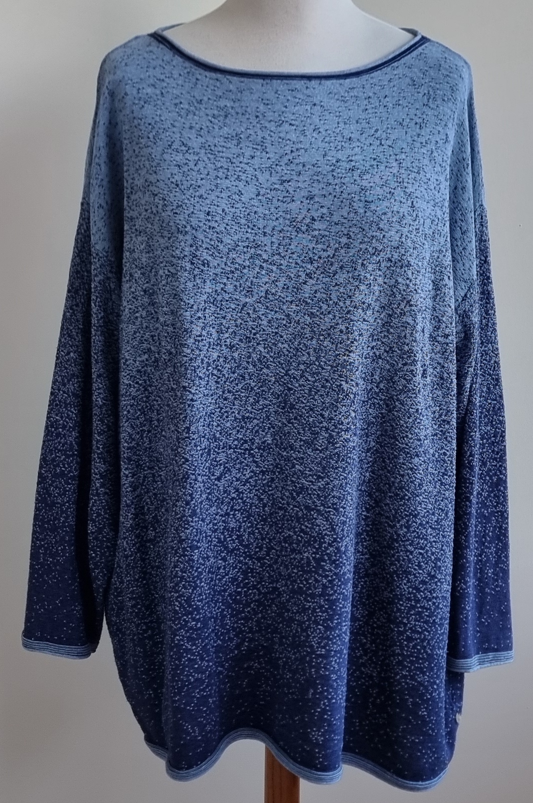 In perfecte staat is deze prachtige trui in verschillende tinten blauw (loopt van licht naar donker) van een gebreid materiaal. De trui is een oversized model en heeft een metalen labeltje in de zijnaad. Lengte 82 cm., breedte 80,5 cm. Materiaal: 100% katoen.
